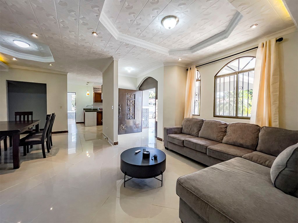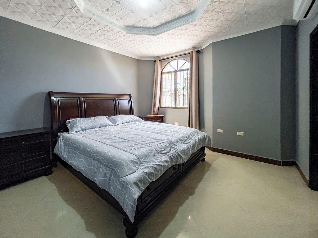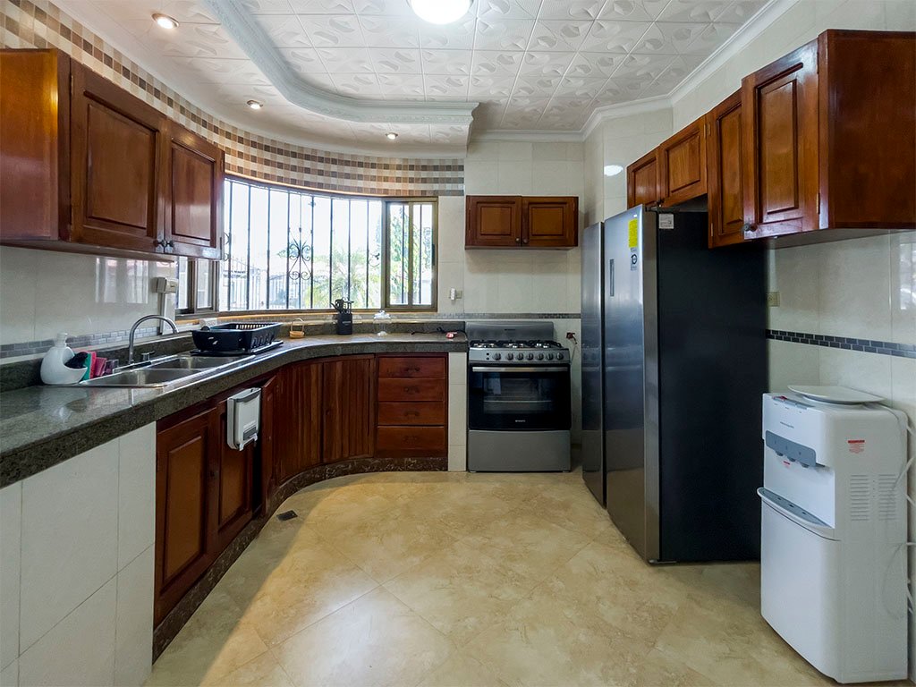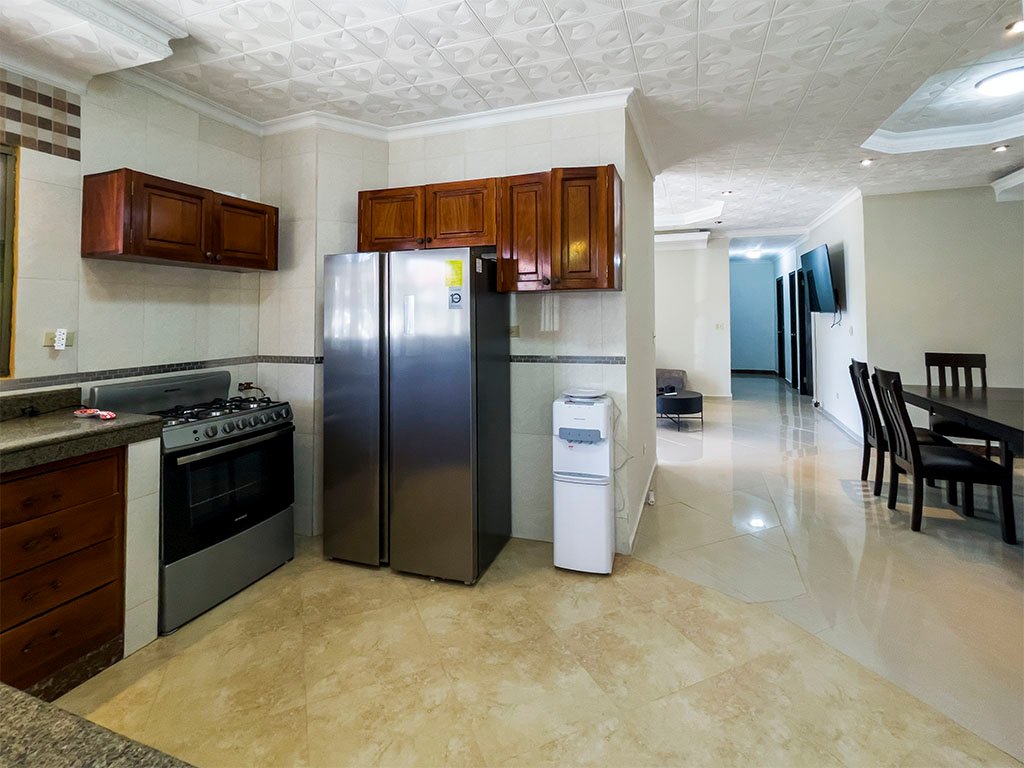 Amoblada / 5 aires acondicionados / 3 espaciosas recamaras (Recamara principal con baño interno), – 2 baños amplios – Cuarto y baño de empleada – Sala / Comedor – Amplia cocina con Gabinetes en Madera y Fregador con triturador de alimentos – Cuarto de oficina – Cuarto de computo – Den y Bar – Terraza Abierta – Lavandería Cerrada – Depósito – Totalmente Cercada con muro y hierro. – Verjas de hierro en puertas y ventanas – Garaje para 2 autos – Puerta cochera – Porche frontal