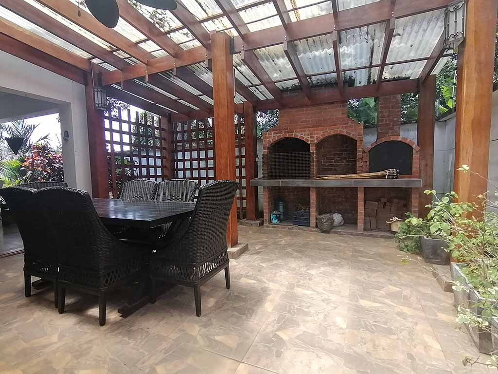 – Área de barbacoa techada con horno de pizza